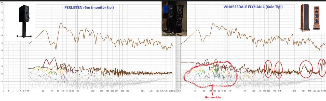 Yukarıda bahsettiğim gibi; hoparlörün en dikkat çekici yanları; temizliği ve hızı. Hoparlör o kadar temiz çalıyor ki, sesi açıyorsunuz ama sanki normalde dinlediğinizden daha az açmış gibi hissediyorsunuz. Halbuki SPL metreyle ölçüm yaptığınızda normal dinleme seviyenizi çoktan geçtiğinizi görüyorsunuz. Bunu internette aynı ürünü inceleyen başka yorumcular da yaşamış. Zaten bildiğiniz gibi distorsiyon arttıkça ses seviyesi aynı kalsa da ses artıyormuş gibi hissettiğimiz için, aynı desibelde distorsiyonlu bir ses distorsiyonsuza göre daha yüksekmiş gibi algılanıyor. Ancak tabi ki, ses kalitesini bozarak ve “artık yeter bu ses çok fazla” dememize neden olarak rahatsızlık veriyor. Cihazın ölçümlerini alırken benzer sınıfta bir cihaz o anda bulamadık ama daha öncesinde R serisinin monitör modeli olan Perlisten R5m ile Wharfedale gibi çok iyi bir markanın lider modeli Elysian 4 modelini aynı odada ölçmüştük. Aşağıdaki grafikte gördüğünüz gibi, küçük monitör bile devasa Elysian 4’ten ne kadar daha temiz. Bu grafiğe bakarsak zaten aslında R7t’yi ölçmemize bile gerek yok.